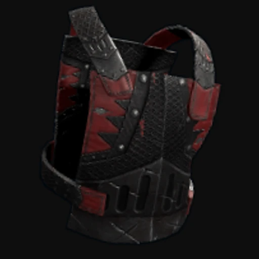 The Dread Chestplate skin transforms the standard Rust Metal Chest Plate into a striking piece of armor, featuring a dark, ominous color palette dominated by deep reds and blacks. The design showcases intricate patterns that evoke a sense of foreboding, with sharp, angular motifs that enhance its menacing aesthetic. This skin retains the protective properties of the Metal Chest Plate, making it a practical choice for players looking to bolster their defenses while embracing a more intimidating look in the game.