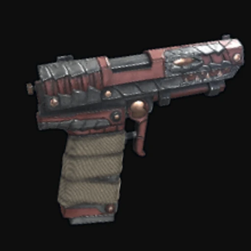 The "Fang" skin for the Rust Semi-Automatic Pistol features a striking design characterized by a dark, ominous color palette dominated by deep blacks and rich reds. The skin showcases a snarling wolf motif, with sharp fangs prominently displayed, giving it a predatory aesthetic that complements the aggressive nature of the weapon. The art style leans toward a gritty, realistic portrayal, enhancing the overall menacing vibe. This skin transforms the standard Semi-Automatic Pistol into a visually impactful sidearm, appealing to players who appreciate a fierce look in their arsenal. The Semi-Automatic Pistol itself is a reliable weapon in Rust, favored for its balance between fire rate and damage, making it a staple choice for both close and mid-range encounters.