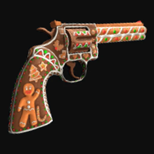 The Gingerbread Python skin transforms the Python Revolver into a festive treat, featuring a warm brown base that mimics the appearance of gingerbread. The design is adorned with white icing-like patterns and colorful candy accents, creating a whimsical, holiday-themed aesthetic. The Python Revolver, known for its versatility and power in Rust, becomes a delightful accessory with this skin, appealing to players who appreciate both functionality and flair in their weaponry.