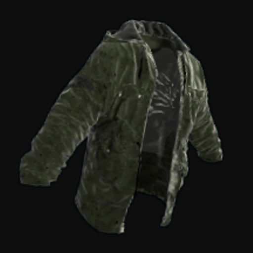 The Green Jacket skin features a vibrant green color that dominates its design, creating a striking appearance against the backdrop of Rust's often harsh environments. The jacket showcases a simple yet effective pattern, with a slightly worn texture that suggests a history of use in the wild. The art style leans towards a realistic representation, capturing the rugged and utilitarian nature of survival gear while ensuring that the bold color stands out. The jacket's design is functional, with pockets and zippers that hint at practicality, making it a fitting choice for players looking to embody a survivalist aesthetic.
