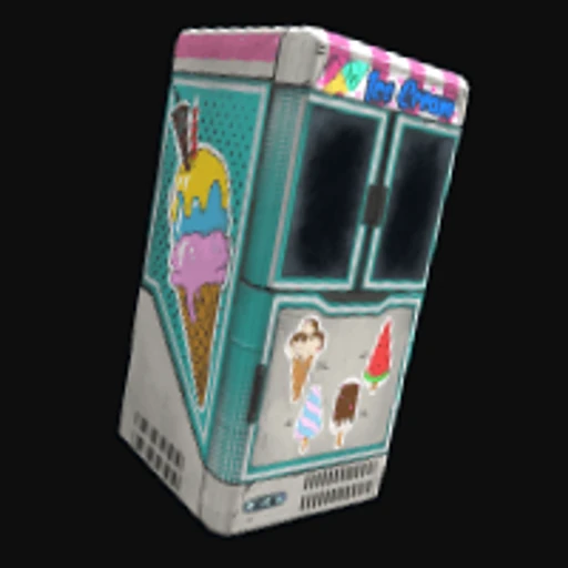 The "Ice Cream Freezer" skin features a vibrant and playful design that evokes the charm of a retro ice cream cart. The primary colors include soft pastels like mint green, pale pink, and creamy white, all of which contribute to a whimsical aesthetic. The skin is adorned with detailed illustrations of ice cream cones and popsicles, creating a lighthearted theme that contrasts sharply with the typically gritty environment of Rust. The art style leans towards cartoonish, making it visually appealing and distinct among other skins.