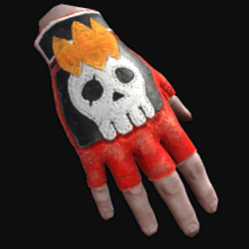 The Merciless Gloves skin transforms the standard Rust Leather Gloves into a striking piece of attire. The gloves feature a dark, metallic aesthetic, predominantly showcasing a deep crimson hue accented with intricate black designs that evoke a sense of danger and aggression. The overall art style leans towards a rugged and industrial look, making them a fitting choice for players who want to convey a fierce persona in the game. As part of the Leather Gloves category, they provide essential protection and functionality, allowing players to gather resources and engage in combat without compromising their style.