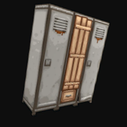 The Pixel Locker skin features a vibrant and colorful design that embraces a pixelated art style, reminiscent of retro video games. The locker itself is adorned with a variety of bright hues, including shades of blue, pink, and green, creating a playful and eye-catching aesthetic. This skin applies to the Locker, a deployable item in Rust that serves as a secure storage solution for players, allowing them to stash their valuable items safely in the game world.