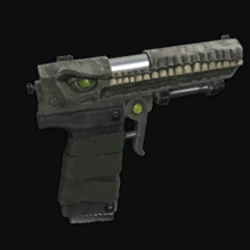 The Poison Jaws SAP is a distinctive Rust Semi-Automatic Pistol skin characterized by its vibrant green and black color scheme, evoking a toxic aesthetic. The design features a menacing jaw motif that wraps around the pistol, emphasizing a predator-like theme. This skin captures a rugged, cartoonish art style that aligns with the game's gritty atmosphere, making the weapon visually striking in combat. The Semi-Automatic Pistol itself is a versatile sidearm in Rust, often favored for its balance of fire rate and damage, making it a reliable choice for both close and mid-range engagements.