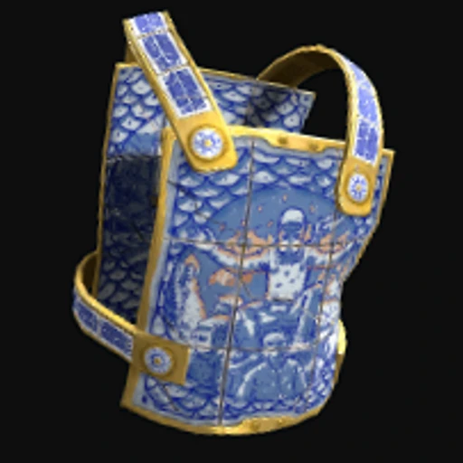 The Porcelain Chestplate skin transforms the standard Metal Chest Plate into an elegant piece of armor, featuring a delicate blue and white color scheme reminiscent of traditional porcelain pottery. The design incorporates intricate floral patterns and swirling motifs, giving it a refined, artistic flair that contrasts sharply with the rugged, utilitarian nature of typical Rust gear. As a piece of attire, the Metal Chest Plate provides substantial protection against attacks, making it a vital component of any player's defensive strategy in the harsh world of Rust.