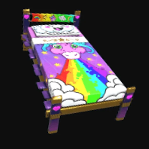 The Rainbow Pony Bed skin features a vibrant and whimsical design that immediately draws attention. The bed is adorned with a colorful array of pastel hues, including soft pinks, blues, and yellows, creating a cheerful and inviting atmosphere. The theme centers around playful imagery of ponies and rainbows, with cartoonish art style elements that evoke a sense of fun and fantasy. The overall look is both charming and lighthearted, making it a perfect addition to any player's base.