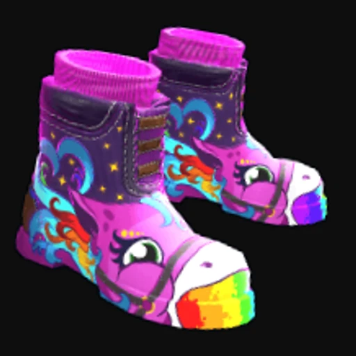 The Rainbow Pony Boots skin features a vibrant and whimsical design that embodies a playful aesthetic. The boots are adorned with a bright, multicolored pattern reminiscent of a cartoonish rainbow, complete with whimsical pony motifs that add to their charm. The art style is bold and eye-catching, making these Rust Boots skin a unique addition to any player's attire. In Rust, boots are essential for movement and mobility, providing players with the necessary footwear to traverse the game's harsh environments while maintaining a touch of flair.