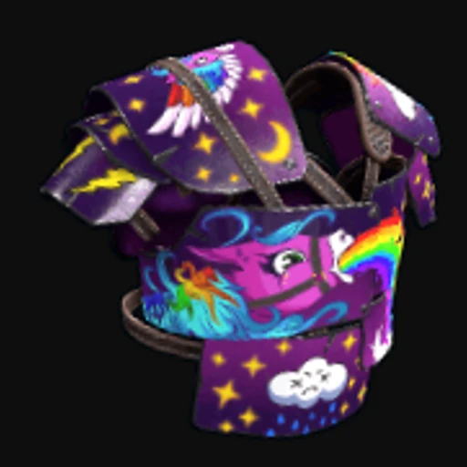 The Rainbow Pony Vest is a vibrant and whimsical Rust Road Sign Jacket skin that features a playful design infused with a spectrum of colors. The vest showcases a lively pattern of multicolored ponies prancing across a bright background, creating a cheerful and eye-catching appearance. This skin transforms the utilitarian road sign jacket into a statement piece, which is typically used for protection against both environmental hazards and enemy attacks in the game. The combination of its protective functionality and unique aesthetic makes the Rainbow Pony Vest a standout choice for players looking to express their personality while navigating the harsh Rust landscape.