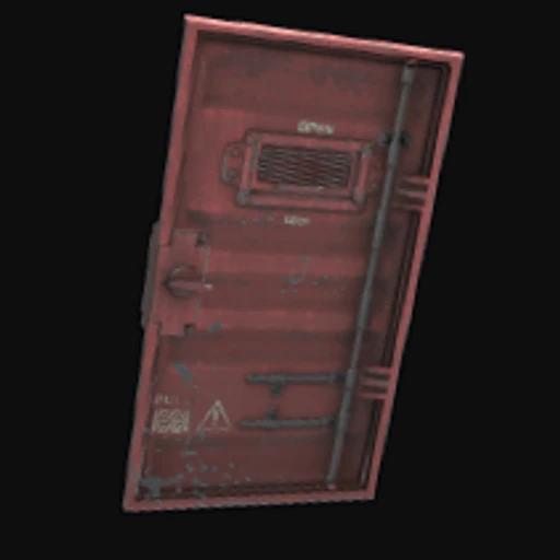 The Red Armored Container Door skin features a striking crimson hue, accentuated by bold black and metallic accents that lend it a rugged, industrial aesthetic. The design incorporates sharp geometric patterns, creating a sense of strength and durability, fitting for one of the game's most formidable barriers. This skin applies to the Armored Door, a crucial item in Rust that provides enhanced protection for player bases, making it a vital component in the defense against raiders and other threats.