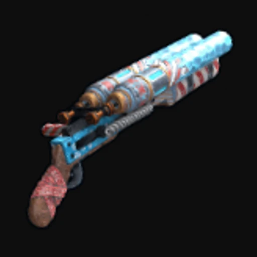 Santa's Blaster is a festive skin designed for the Rust Double Barrel Shotgun, featuring a vibrant color palette dominated by red and white, reminiscent of traditional holiday themes. The shotgun is adorned with playful illustrations of Santa Claus, snowflakes, and Christmas ornaments, giving it a whimsical, cheerful aesthetic. The art style captures a cartoonish charm, making this skin a striking addition to any player's arsenal. The Double Barrel Shotgun itself is a formidable weapon in Rust, known for its high damage output at close range, making it a popular choice for ambush tactics and defending against intruders.