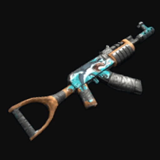 The Shark AR skin is designed for the Rust Assault Rifle, showcasing a vibrant and aggressive aesthetic that captures the essence of its namesake predator. The skin features a striking blue and gray color palette, reminiscent of a shark's natural hues, with intricate patterns that evoke the texture of ocean waves. The art style leans towards a cartoonish yet fierce representation, with sharp lines and bold contrasts that make the weapon visually appealing. This skin not only enhances the look of the Assault Rifle but also reflects the ferocity associated with its gameplay, as players often rely on this weapon for both mid-range and close-quarters combat.