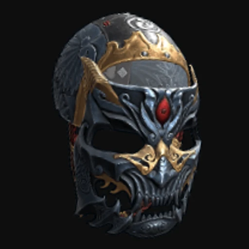 The Shogun Facemask is a visually striking Rust Metal Facemask skin that features a bold and intricate design inspired by traditional Japanese aesthetics. The mask is adorned with a rich color palette, predominantly showcasing deep reds and blacks, complemented by ornate gold detailing that mimics the appearance of ancient armor. The art style combines elements of realism with stylized motifs, creating a fierce look that enhances the intimidating presence of the player. In Rust, the Metal Facemask serves as crucial protective attire, offering significant defense against attacks while allowing players to maintain a distinct visual identity.