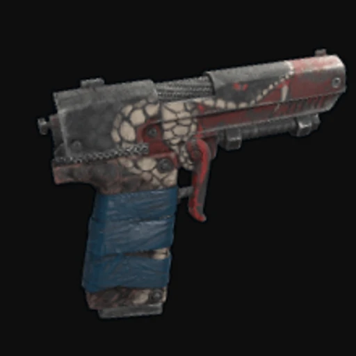 The Silent Sting SAP is a visually striking skin for the Rust Semi-Automatic Pistol, featuring a sleek black base adorned with sharp, angular patterns in shades of teal and silver. The design evokes a sense of stealth and precision, with a modern art style that reflects a tactical aesthetic. The skin enhances the pistol's silhouette, making it look both menacing and refined. The Semi-Automatic Pistol itself is a versatile sidearm in Rust, known for its balance of power and rate of fire, making it a popular choice for players engaged in both PvP and PvE encounters.