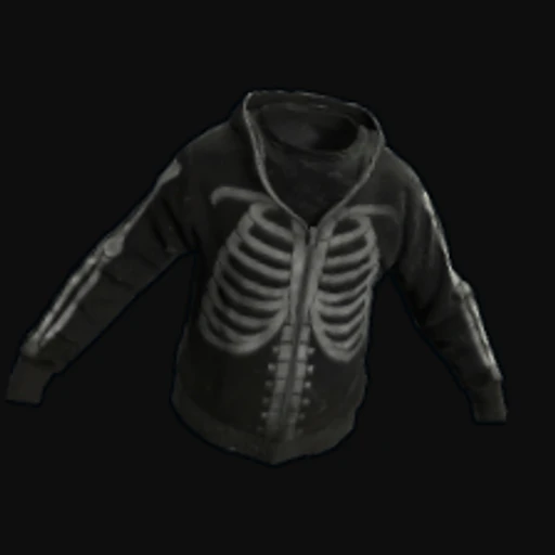The Skeleton Hoodie skin features a striking design that combines a dark, ominous color palette with a vivid skeletal pattern across the fabric. This Rust Hoodie skin showcases a blend of black and white, with the bones intricately detailed, giving it a haunting yet stylish appearance. The hoodie is an essential piece of attire in Rust, providing players with warmth and a degree of protection from the elements while allowing for mobility during exploration and combat.