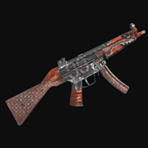 The Spitfire MP5 skin features a striking design dominated by fiery shades of orange and red, reminiscent of flames licking at the edges. The pattern incorporates intricate details that evoke a sense of heat and intensity, making the weapon visually captivating. This skin is specifically applied to the MP5A4, a submachine gun known for its versatility and effectiveness in close-quarters combat within Rust. Players often utilize the MP5A4 for its rapid fire rate and manageable recoil, making it a popular choice for both raiding and defending bases.