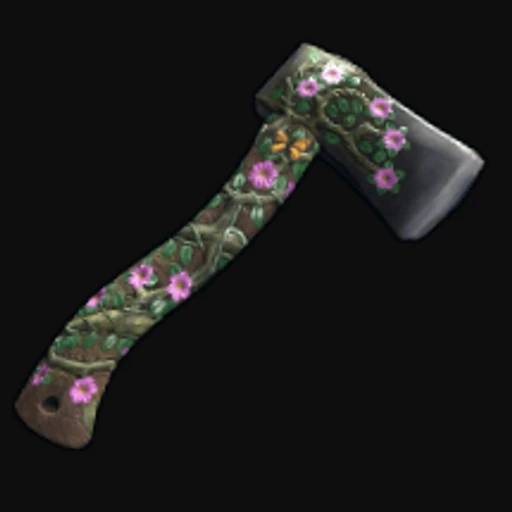 The Spring Hatchet skin transforms the standard Rust Hatchet into a vibrant tool adorned with a lively floral pattern. The design features a mix of bright greens and pastel colors, evoking the essence of springtime with blooming flowers and lush foliage. This art style leans towards a whimsical aesthetic, providing a refreshing contrast to the often gritty atmosphere of Rust. The Hatchet itself is a versatile tool primarily used for gathering resources like wood, making it essential for crafting and building within the game.
