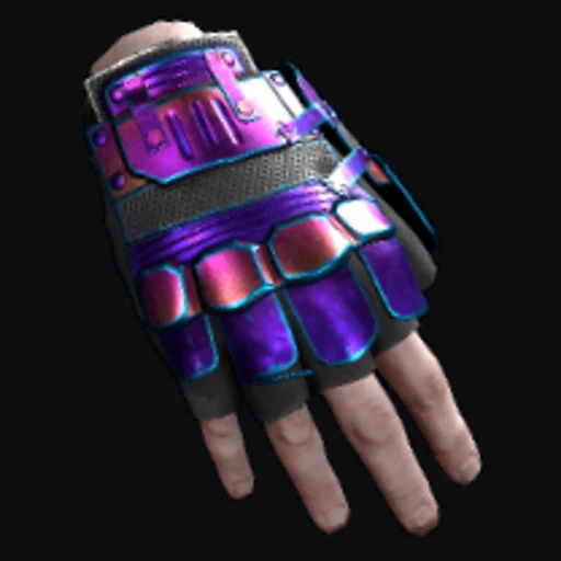The Tempered Roadsign Gloves feature a striking design characterized by a deep, rust-colored base that evokes a sense of ruggedness. The gloves are adorned with dark metallic accents that resemble weathered steel, giving them an industrial appearance. The surface is textured, mimicking the look of worn armor, and the overall aesthetic fits well within the post-apocalyptic theme of Rust. The combination of colors and materials results in a gritty, utilitarian look that pairs well with various outfits in the game, making them a popular choice for players looking to enhance their character's visual style.