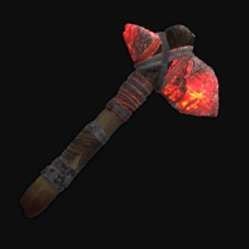 The Volcanic Stone Hatchet skin features a striking design that evokes the raw power of molten lava. The skin showcases a blend of deep reds, oranges, and blacks, creating a fiery appearance that resembles a cooled lava flow. The intricate pattern highlights jagged, flowing lines, giving the impression of a weapon forged in the heart of a volcano. The skin applies to the Stone Hatchet, a vital tool in Rust used for gathering resources like wood and stone, making it essential for crafting and building.