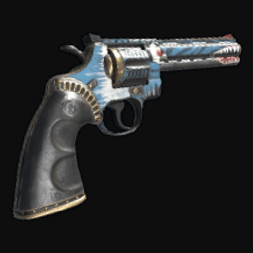 The Bite Python skin features a striking design that combines vibrant colors with a snake-themed motif. The Python Revolver is adorned with a vivid green and black pattern that mimics the scales of a snake, creating a fierce appearance that complements the weapon's design. The art style leans towards a stylized, cartoonish aesthetic, giving it a unique flair that stands out in the game. The Python Revolver itself is a powerful sidearm in Rust, known for its high damage output and versatility in combat, making it a favored choice for players looking to engage in both close and mid-range encounters.