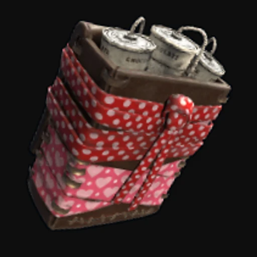 The "Box O Love" is a vibrant and whimsical Rust Satchel Charge skin that features a playful design reminiscent of a gift box adorned with hearts and colorful patterns. The primary color scheme includes bright reds, pinks, and whites, creating a cheerful aesthetic that stands out against the typically gritty environment of Rust. The art style is cartoonish, with bold outlines and a fun, lighthearted theme that contrasts sharply with the destructive purpose of the Satchel Charge, which is used for demolishing structures and gaining entry into bases.