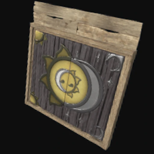 The Celestial Harmony Double Door skin features a striking design that juxtaposes the sun and moon against a backdrop of rich wood tones and metallic accents. The intricate patterns blend celestial motifs with a harmonious color palette, creating a visually appealing contrast that catches the eye. This skin is applied to the Wood Double Door, a common construction item in Rust, which serves as an essential barrier for bases, providing a sturdy entry point that players can fortify against intruders.