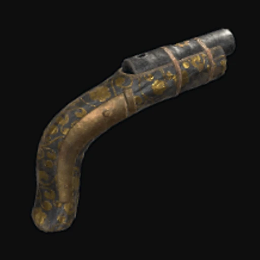 The Japanese Tanegashima skin is designed for the Rust Eoka Pistol, featuring a rich, intricate pattern that draws inspiration from traditional Japanese aesthetics. The skin showcases a blend of deep reds and blacks, reminiscent of lacquered wood, accented by delicate floral motifs that evoke a sense of craftsmanship. The overall art style leans towards a classic, ornate appearance, making the Eoka Pistol not just a weapon but also a piece of art. This pistol is primarily used for close-range combat in Rust, offering players a balance of power and accessibility, especially in the early stages of gameplay.