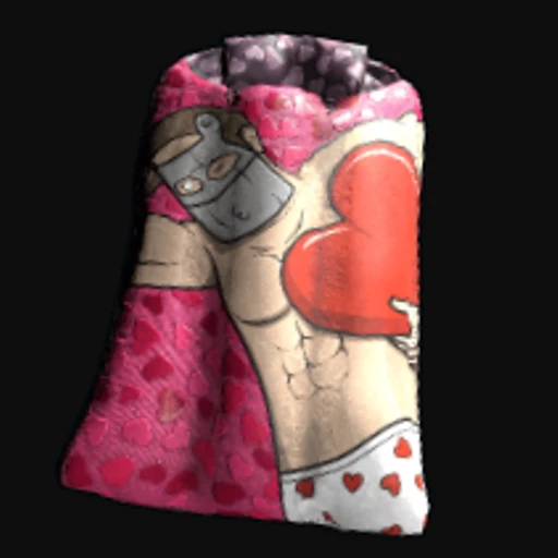 The Lover Giorgio skin for the Rust Sleeping Bag features a vibrant and playful design that showcases a romantic theme. The primary colors include soft pinks and deep reds, adorned with whimsical graphics of hearts and flowers. The art style leans towards a cartoonish aesthetic, giving it a lighthearted appearance that contrasts with the often harsh environment of Rust. Sleeping Bags serve as respawn points for players, making them essential for survival, and the Lover Giorgio skin adds a touch of charm to this crucial item.
