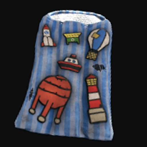 The "Monument Memories" Rust Sleeping Bag skin features a vibrant and nostalgic design, incorporating a mix of warm colors like deep orange and soft yellows against a backdrop of rich blues and greens. The artwork showcases stylized representations of iconic monuments that evoke a sense of adventure and exploration, blending seamlessly with the game's post-apocalyptic aesthetic. This skin transforms the standard sleeping bag into a visually striking item, enhancing the player's base with its artistic flair. Sleeping Bags in Rust serve as critical deployables for respawning, allowing players to set their spawn points in strategic locations.