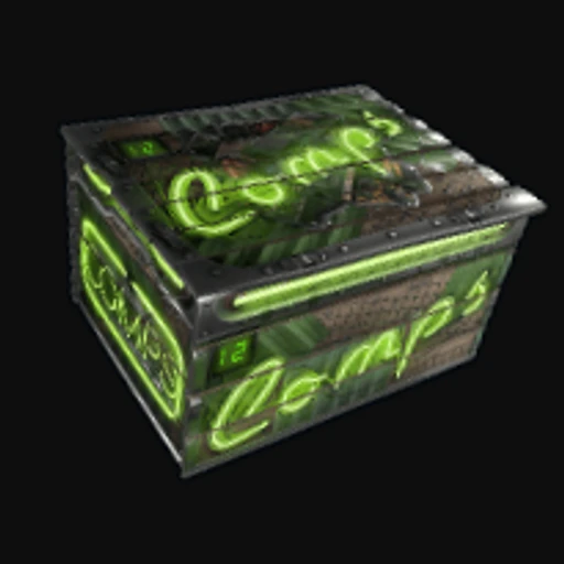 The Neon Small Comps Storage is a vibrant Rust Wood Storage Box skin that features a striking blend of neon colors, primarily showcasing bright pinks and greens against a dark background. The design is characterized by geometric patterns and abstract shapes that evoke a sense of modernity and energy, making it a visually appealing choice for players looking to add flair to their in-game storage solutions. The Wood Storage Box itself is a crucial item in Rust, utilized for storing various resources and components, allowing players to organize their materials effectively.
