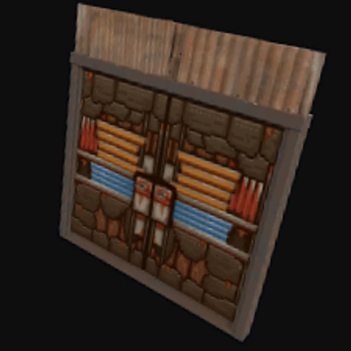 The Pixel Metal Double Door skin features a vibrant, pixelated design that gives the standard Rust Sheet Metal Double Door a retro video game aesthetic. The skin showcases a blend of bright colors, predominantly neon pinks and greens, arranged in a grid-like pattern reminiscent of classic pixel art. This theme adds a playful and nostalgic touch to the otherwise utilitarian door, which serves as a crucial entry point for bases in Rust, providing players with a means to secure their structures against intruders.