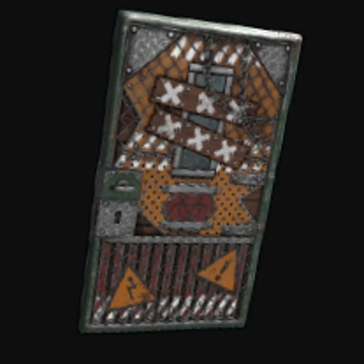 The Quarantine Area skin for the Rust Sheet Metal Door features a striking design that combines an industrial aesthetic with a post-apocalyptic theme. The door is adorned with a mix of muted greens and grays, evoking a sense of decay and neglect. Bold yellow hazard stripes and biohazard symbols are prominently displayed, reinforcing the quarantine theme and creating a visually arresting contrast against the darker background. This skin transforms a standard construction item into a statement piece, reflecting the harsh realities of survival in the game.