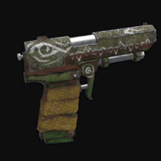 The Reptile SAP is a visually striking skin for the Rust Semi-Automatic Pistol, featuring a vibrant green and black color scheme that mimics the scales of a reptile. The art style leans towards a stylized realism, showcasing intricate scales that wrap around the weapon, creating a sense of depth and texture. This design not only enhances the aesthetic appeal of the Semi-Automatic Pistol but also aligns with the rugged survival theme of Rust. The pistol itself serves as a reliable sidearm, favored for its balance of fire rate and damage, making it a common choice for players engaging in both PvP encounters and wildlife defense.