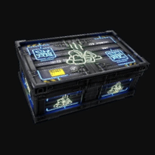 The "Sinotype Charcoal" skin is a visually striking design for the Rust Large Wood Box. It features a predominantly dark charcoal color palette, accented with intricate geometric patterns that evoke a modern and industrial aesthetic. The art style leans towards a minimalist approach, focusing on clean lines and subtle textures that give the box a sophisticated look while still fitting into the rugged environment of Rust. The Large Wood Box serves as an essential storage solution, providing players with a secure way to store their resources, crafting materials, and other items while they explore the game world.